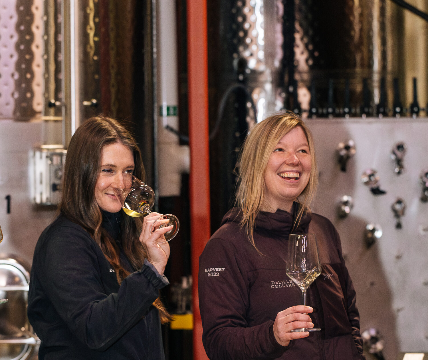 Assistant Winemaker Mari and Enologist Page tasting a barrel of Chaleur Blanc before it’s pumped into a tank for bottling.
