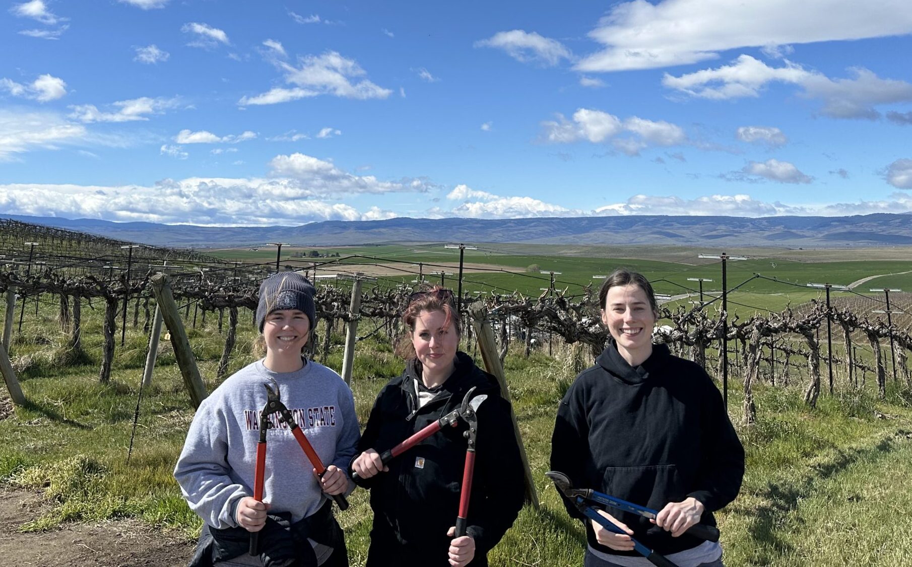Cellar Leads Kaitlyn, Sigrid and Lindsay getting ready to prune at Red Willow Vineyard.